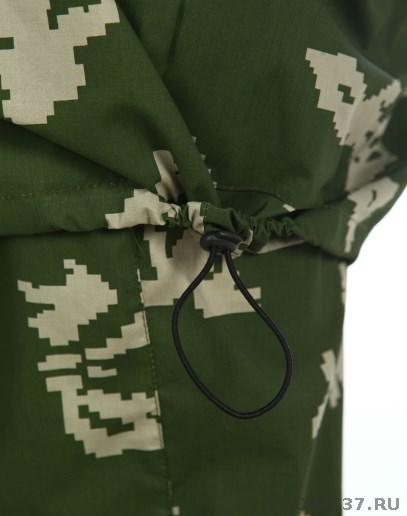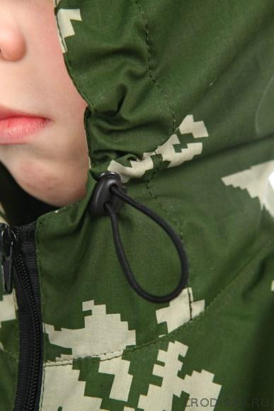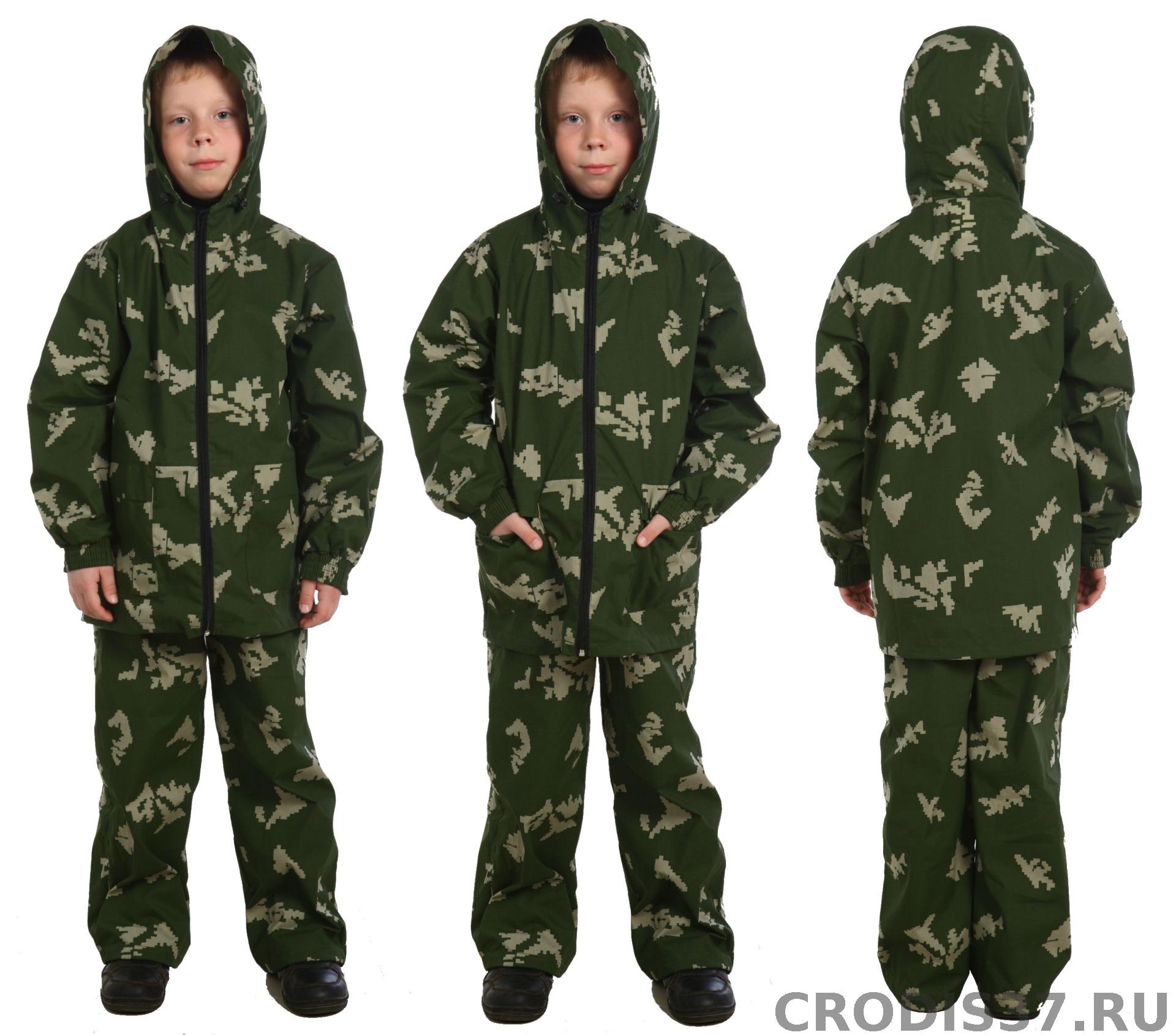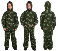 Костюм детский камуфлированный летний выполнен из сорочечной ткани. Куртка на молнии, свободного кроя. Брюки на резинке стягиваются шнуром, имеются 2 прорезных кармана.