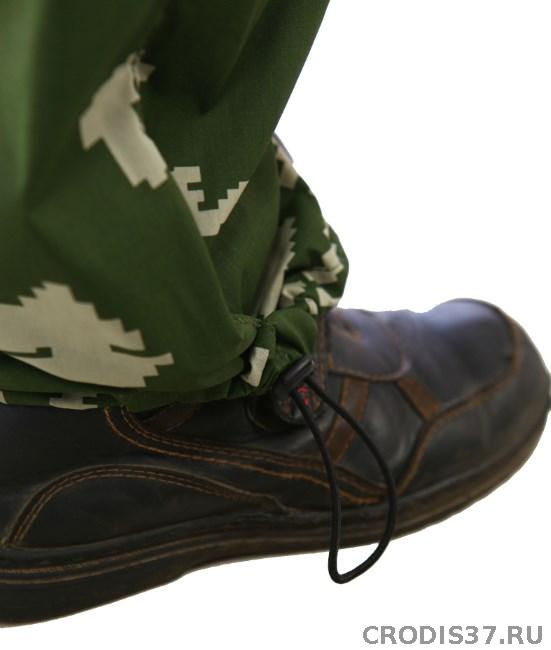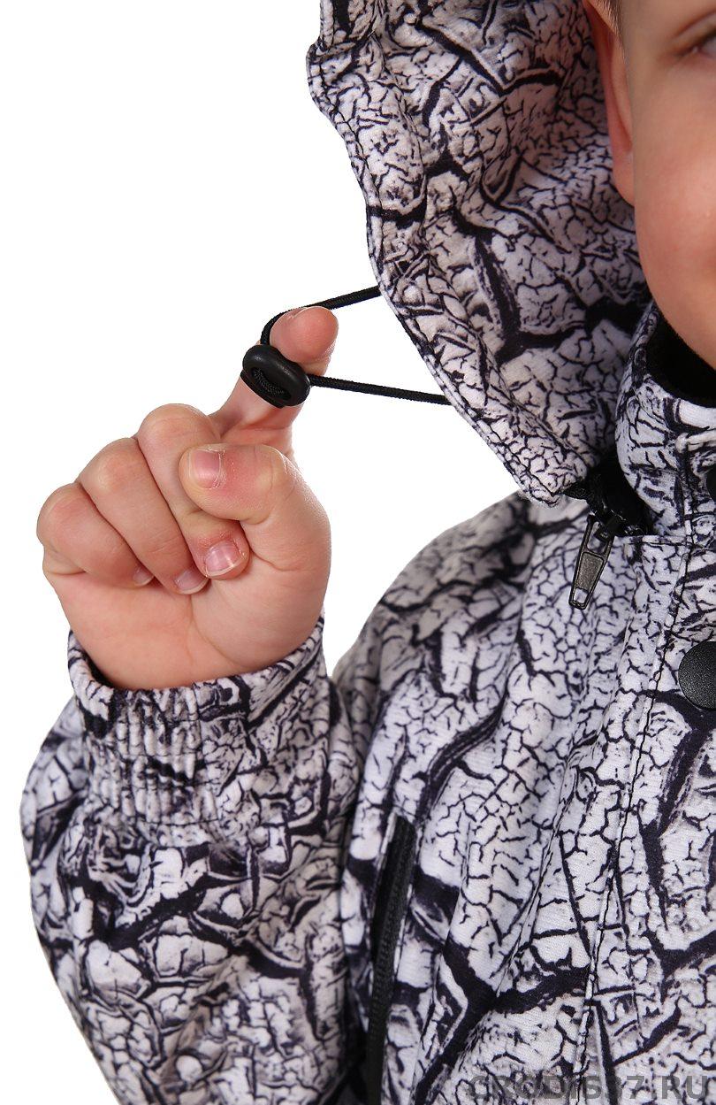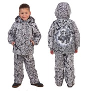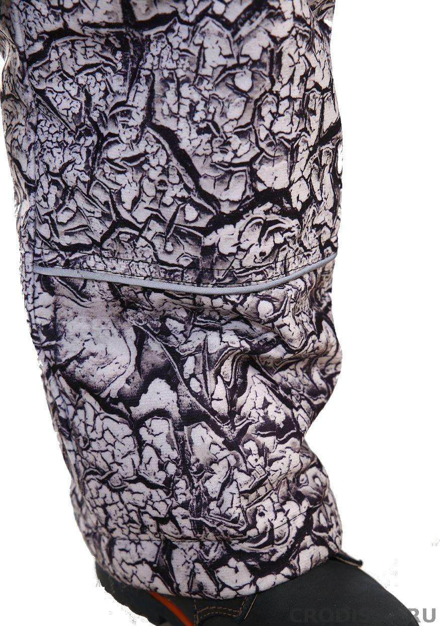 Комбинезон с застежкой на молнию. Имеется два боковых прорезных кармана на молнии, утепленные флисом. Съемный капюшон на липучках, регулируется резинкой с фиксаторами. Воротник - стойка, утеплен флисом. На куртке имеется огибающая замок молнии планка, для исключения контакта замка молнии с шеей и подбородком. Рукава имеют внутренний эластичный трикотажный манжет. Брючины комбинезона усилены наколенниками. Снизу в брючине вшита снегозащитная манжета на резинке.